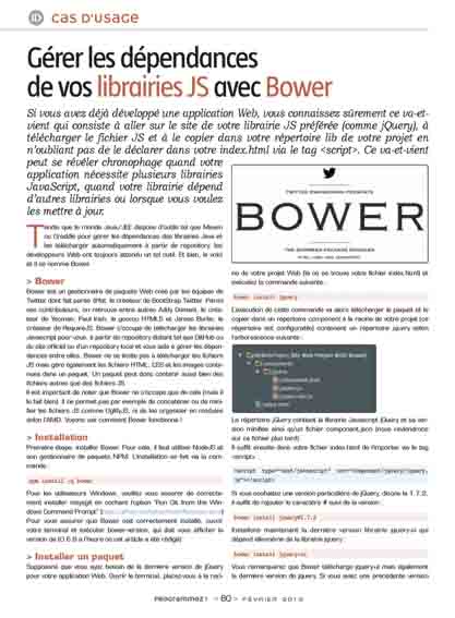 Tandis que le monde Java/JEE dispose d’outils tel que Maven ou Graddle pour gérer les dépendances des librairies Java et les télécharger automatiquement à partir de repository, les développeurs Web ont toujours attendu un tel outil. Et bien, le voici et il se nomme Bower.