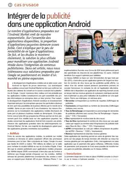 Le nombre d’applications proposées sur l’Android Market croît de manière exponentielle. Sur l’ensemble des applications disponibles, la proportion d’applications payantes demeure assez faible. Ceci s’explique par le peu de rentabilité de ce type d’applications. De fait, et les études le montrent clairement, la solution la plus utilisée pour monétiser une application Android réside dans l’intégration de contenus publicitaires. Dans cet article, nous nous intéressons aux solutions proposées par Google se positionnant en leader d’un marché en pleine expansion.