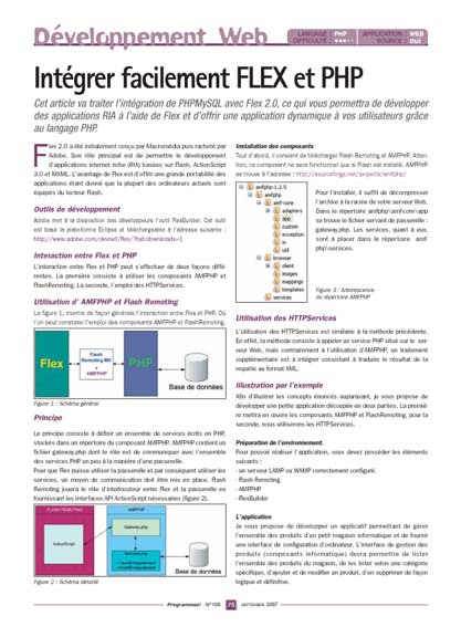 Cet article va traiter l’intégration de PHPMySQL avec Flex 2.0, ce qui vous permettra de développer des applications RIA à l’aide de Flex et d’offrir une application dynamique à vos utilisateurs grâce au langage PHP. Flex 2.0 a été initialement conçu par Macromédia puis racheté par Adobe. Son rôle principal est de permettre le développement d’applications internet riche (RIA) basées sur Flash, ActionScript 3.0 et MXML. L’avantage de Flex est d’offrir une grande portabilité des applications étant donné que la plupart des ordinateurs actuels sont équipés du lecteur Flash.