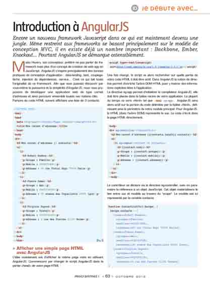 Misko Hevery, son concepteur, préfère ne pas parler de framework mais plus d’un concept de création de web app en JavaScript. AngularJS s’inspire principalement des bonnes pratiques de conception d’application : data-binding, test, couplagelâche, injection de dépendances, service... C’est ce qui fait toute l’originalité de ce framework. Afin que vous puissiez découvrir par vous-même la puissance et la simplicité d’AngularJS, nous vous proposons de développer une application web de type carnet d’adresses et ainsi parcourir ensemble toutes ses notions clés.