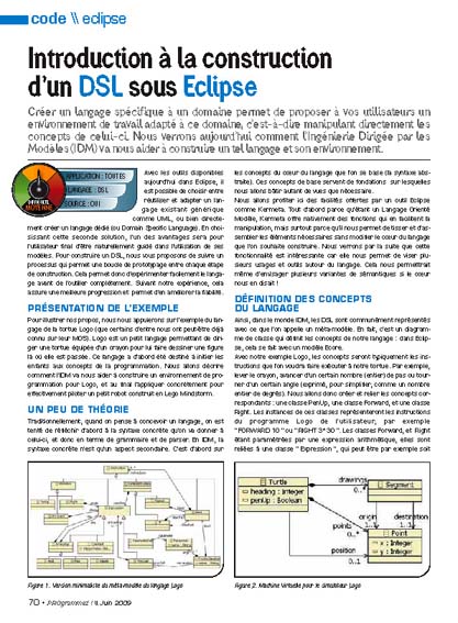 Avec les outils disponibles aujourd'hui dans Eclipse, il est possible de choisir entre réutiliser et adapter un langage existant générique comme UML, ou bien directement créer un langage dédié (ou Domain Specific Language). En choisissant cette seconde solution, l'un des avantages sera pour l'utilisateur final d’être naturellement guidé dans l'utilisation de ses modèles. Pour construire un DSL, nous vous proposons de suivre un processus qui permet une boucle de prototypage entre chaque étape de construction. Cela permet donc d'expérimenter facilement le langage avant de l'outiller complètement. Suivant notre expérience, cela assure une meilleure progression et permet d'en améliorer la fiabilité.