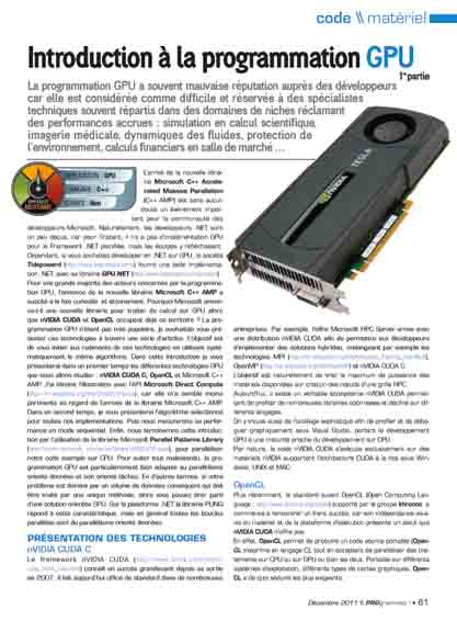 L’arrivé de la nouvelle librairie Microsoft C++ Accelerated Massive Parallelism (C++ AMP) est sans aucun doute un évènement important pour la communauté des développeurs Microsoft. Naturellement, les développeurs .NET sont un peu déçus, car pour l’instant, il n’y a pas d’implémentation GPU pour le Framework .NET planifiée, mais les équipes y réfléchissent. Cependant, si vous souhaitez développer en .NET sur GPU, la société Tidepowerd (http://www.tidepowerd.com/) fournit une belle implémentation .NET, avec sa librairie GPU.NET (http:/www.tidepowerd.com/product). Pour une grande majorité des acteurs concernés par la programmation GPU, l’annonce de la nouvelle librairie Microsoft C++ AMP a suscité à la fois curiosité et étonnement. Pourquoi Microsoft annonce- t-il une nouvelle librairie pour traiter du calcul sur GPU alors que nVIDIA CUDA et OpenCL occupent déjà ce territoire ? La programmation GPU n’étant pas très populaire, je souhaitais vous présenter ces technologies à travers une série d’articles. L’objectif est de vous initier aux rudiments de ces technologies en utilisant systématiquement le même algorithme. Dans cette introduction je vous présenterai dans un premier temps les différentes technologies GPU que nous allons étudier : nVIDIA CUDA C, OpenCL et Microsoft C++ AMP.