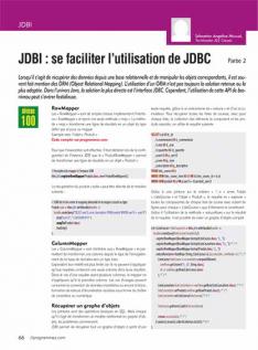 Partie Lorsqu’il s’agit de récupérer des données depuis une base relationnelle et de manipuler les objets correspondants, il est souvent fait mention des ORM (Object Relational Mapping). L’utilisation d’un ORM n’est pas toujours la solution retenue ou la plus adaptée. Dans l’univers Java, la solution la plus directe est l’interface JDBC. Cependant, l’utilisation de cette API de basniveau peut s’avérer fastidieuse.
