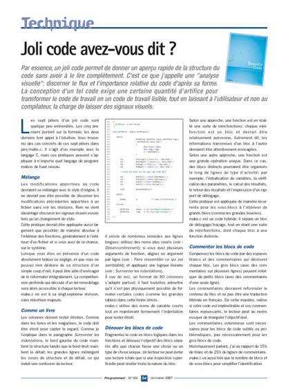 Par essence, un joli code permet de donner un aperçu rapide de la structure du code sans avoir à le lire complètement. C'est ce que j'appelle une "analyse visuelle": discerner le flux et l'importance relative du code d'après sa forme. La conception d'un tel code exige une certaine quantité d'artifice pour transformer le code de travail en un code de travail lisible, tout en laissant à l'utilisateur et non au compilateur, la charge de laisser des signaux visuels.