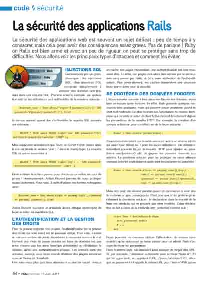 La sécurité des applications web est souvent un sujet délicat : peu de temps à y consacrer, mais cela peut avoir des conséquences assez graves. Pas de panique ! Ruby on Rails est bien armé et avec un peu de rigueur, on peut se protéger sans trop de difficultés. Nous allons voir les principaux types d'attaques et comment les éviter.