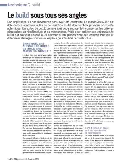 Une application n’a pas d’existence sans avoir été construite. Le monde Java/JEE est doté de très nombreux outils de construction (build) dont le choix provoque souvent la polémique. Un script de build, comme tout code source doit comporter les critères nécessaires de réutilisabilité et de maintenance. Mais pour faciliter son intégration, le build est souvent adossé à un serveur d’intégration continue comme Hudson et différentes stratégies sont mises en place pour faciliter la construction