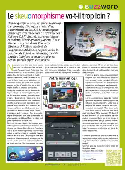Depuis quelques mois, on parle beaucoup d’ergonomie, d’interfaces naturelles, d’expérience utilisateur. Et nous voyons bien les grandes tendances d’uniformisation : iOS vers OS X, Android sur smartphone et tablette, Microsoft avec Modern UI sur Windows 8 / Windows Phone 8 / Windows RT. Mais, au-delà de l’expérience utilisateur, se pose aussi la question de l’objet en lui-même, c’est-àdire de l’interface et comment elle est définie par les objets eux-mêmes.