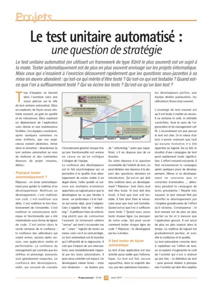 Le test unitaire automatisé (en utilisant un framework de type XUnit le plus souvent) est un sujet à la mode. Tester automatiquement est de plus en plus souvent envisagé sur les projets informatique. Mais ceux qui s’essaient à l’exercice découvrent rapidement que les questions sous-jacentes à sa mise en oeuvre abondent : qu’est-ce qui mérite d’être testé ? Qu’est-ce qui est testable ? Quand estce que l’on a suffisamment testé ? Qui va écrire les tests ? Qu’est-ce qu’un bon test ?
