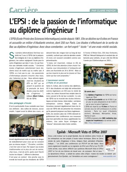 L’EPSI (Ecole Privée des Sciences Informatiques) existe depuis 1961. Elle se décline sur 6 sites en France et accueille un millier d’étudiants environ, dont 250 sur Paris. Les études s’effectuent de la sortie du Bac au diplôme d’ingénieur. Avec deux constantes : un fort esprit " école " et une vraie mixité sociale.