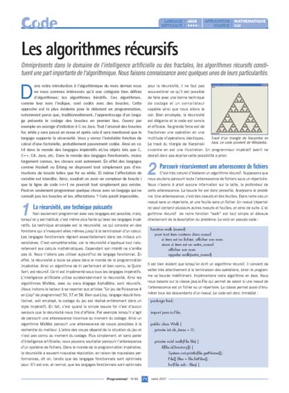 Omniprésents dans le domaine de l'intelligence artificielle ou des fractales, les algorithmes récursifs constituent une part importante de l'algorithmique. Nous faisons connaissance avec quelques unes de leurs particularités.