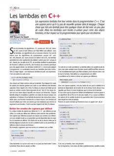 Les expressions lambdas font leur entrée dans la programmation C++. C’est une surprise parce qu’il n’y pas de nouvelle syntaxe dans le langage. Chaque chose que fait une lambda peut être quelque chose de fait avec un peu plus de code. Mais les lambdas sont faciles à utiliser pour créer des objets fonctions, et leur impact sur la programmation jour après jour est énorme.