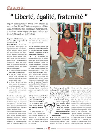 Richard Stallman : Je puis expliquer la base philosophique du logiciel libre en trois mots: liberté, égalité, fraternité. Liberté, parce que les utilisateurs sont libres. Egalité, parce qu'ils disposent tous des mêmes libertés. Fraternité, parce que nous encourageons chacun à coopérer dans la communauté.