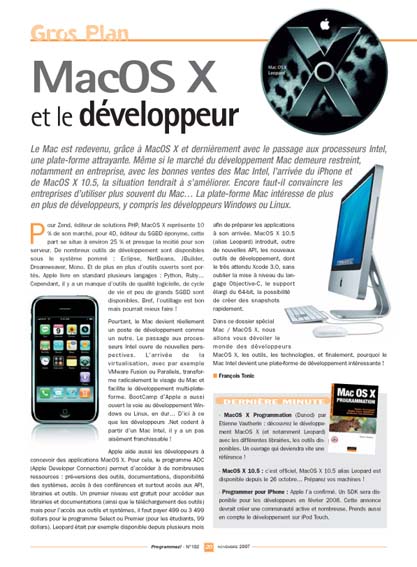 Le Mac est redevenu, grâce à MacOS X et dernièrement avec le passage aux processeurs Intel, une plate-forme attrayante. Même si le marché du développement Mac demeure restreint, notamment en entreprise, avec les bonnes ventes des Mac Intel, l’arrivée du iPhone et de MacOS X 10.5, la situation tendrait à s’améliorer. Encore faut-il convaincre les entreprises d’utiliser plus souvent du Mac… La plate-forme Mac intéresse de plus en plus de développeurs, y compris les développeurs Windows ou Linux.