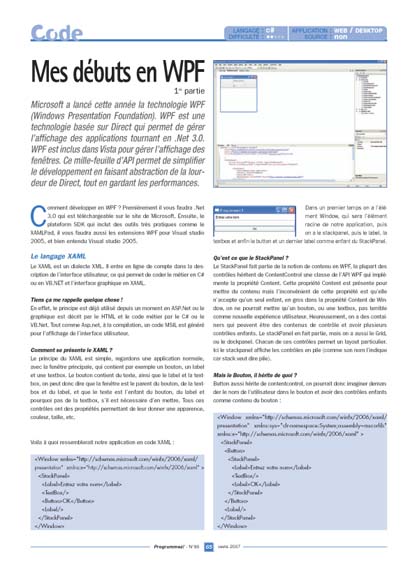 Le XAML est un dialecte XML. Il entre en ligne de compte dans la description de l’interface utilisateur, ce qui permet de coder le métier en C# ou en VB.NET et l’interface graphique en XAML.