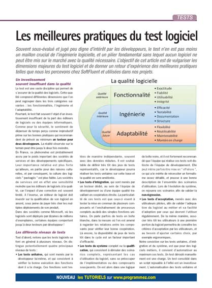 Les tests recouvrent en réalité une multitude de formes, d’outils, de pratiques. Surtout, ils interviennent à tout instant de la programmation, à la phase de conception, on peut piloter le développement par les cas de tests (approche MDT, Model Driven Testing, notamment). Et chaque module, chaque classe peut recevoir un test spécifique. Les tests unitaires sont aujourd’hui les plus utilisés par les développeurs, essentiellement grâce aux divers frameworks comme Junit, PHPUnit. Il y a autant de types de tests que de scénarios. Ainsi au sein d’un même projet, on aura différents types de tests : au plus près du code jusqu’aux tests de déploiement, de stress, de montée en charge, sans oublier les tests d’interface, de non régression, etc. Et là à chaque catégorie, correspondent des bonnes pratiques, des outils spécifiques.
