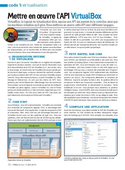 "Virtualisez vos Linux avec VirtualBox" (Programmez! 124) nous a appris à manipuler VirtualBox, un logiciel de virtualisation offert par Sun Microsystems assez épatant, surtout si l'on considère son prix. Toutes les manipulations faites à la main, c'est le cas de le dire, dans l'article cité, peuvent aussi être faites par programmation, sur la machine hôte, et même dans une certaine mesure à distance. Nous nous intéresserons à tout cela aujourd'hui