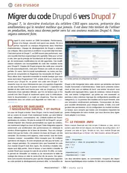 Drupal 6 s’est montré un CMS formidable. Performance, tenue à la charge, sécurité sont parmi ses atouts. On lui a parfois reproché un manque d’ergonomie dans l’interface d’administration. L’équipe de développement de Drupal a entendu ces critiques. Elle a aussi tenu à améliorer ce qui était déjà très bien. C’est ainsi qu’est né Drupal 7, un CMS encore plus performant, avec une nouvelle interface ergonomique très agréable. Mais pour arriver à cela, bien que le principe de l’architecture de Drupal reste inchangé, de nombreuses modifications lui ont été apportées. Ces modifications induisent une incompatibilité de code des modules écrits pour Drupal 6. L’équipe de Drupal propose des outils pour convertir le code automatiquement, mais pour l’instant ces outils ne sont pas parfaits. En outre, faire le travail manuellement, au moins une fois, permet de comprendre et d’apprécier les nouveautés de Drupal 7. Nous allons donc reprendre ensemble le module basique que nous avons écrit dans Programmez! 123, article «Ecrire un module d’extension pour Drupal 6», et porter son code vers Drupal 7. En revanche nous ne nous intéresserons pas à la question d’upgrader un site sous Drupal 6 pour le passer sous Drupal 7. L’opération est faisable et des outils sont fournis pour cela sur drupal.org. Il s’agit néanmoins d’une opération délicate, que l’on ne tentera que si l’on connaît très bien Drupal et seulement après avoir lu méticuleusement la documentation à ce sujet sur drupal.org.