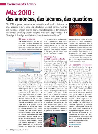 Mix 2010, la grande conférence web annuelle de Microsoft qui s’est tenue à Las Vegas du 15 au 17 mars, était attendue au tournant. Dans un mélange des genres pas toujours heureux pour la visibilité auprès des développeurs, Microsoft a dévoilé plusieurs briques techniques importantes : IE9, Silverlight 4, Siverlight Mobile, Blend 4, et même Windows Phone 7 !