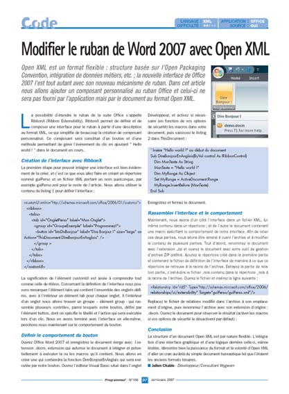 Open XML est un format flexible : structure basée sur l’Open Packaging Convention, intégration de données métiers, etc. ; la nouvelle interface de Office 2007 l’est tout autant avec son nouveau mécanisme de ruban. Dans cet article nous allons ajouter un composant personnalisé au ruban Office et celui-ci ne sera pas fourni par l’application mais par le document au format Open XML. La possibilité d’étendre le ruban de la suite Office s’appelle RibbonX (Ribbon Extensibility). RibbonX permet de définir et de composer une interface pour le ruban à partir d’une description au format XML, ce qui simplifie de beaucoup la création de composant personnalisé. Ce composant sera constitué d’un bouton et d’une méthode permettant de gérer l’évènement du clic en ajoutant " Hello world ! " dans le document en cours.