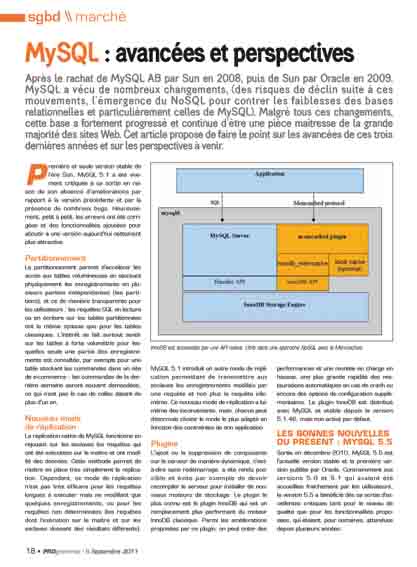Après le rachat de MySQL AB par Sun en 2008, puis de Sun par Oracle en 2009, MySQL a vécu de nombreux changements, (des risques de déclin suite à ces mouvements, l'émergence du NoSQL pour contrer les faiblesses des bases relationnelles et particulièrement celles de MySQL). Malgré tous ces changements, cette base a fortement progressé et continue d'être une pièce maîtresse de la grande majorité des sites Web. Cet article propose de faire le point sur les avancées de ces trois dernières années et sur les perspectives à venir.