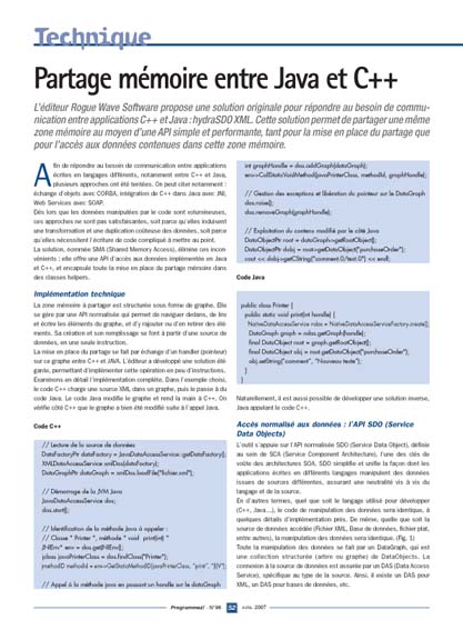 L’éditeur Rogue Wave Software propose une solution originale pour répondre au besoin de communication entre applications C++ et Java :hydraSDO XML. Cette solution permet de partager une même zone mémoire au moyen d’une API simple et performante, tant pour la mise en place du partage que pour l’accès aux données contenues dans cette zone mémoire.