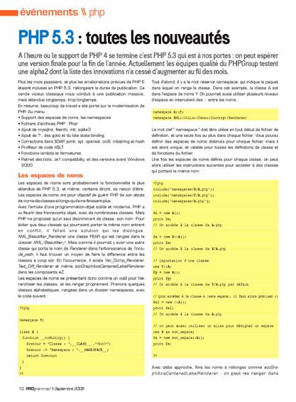 A l'heure ou le support de PHP 4 se termine c'est PHP 5.3 qui est à nos portes : on peut espérer une version finale pour la fin de l'année. Actuellement les équipes qualité du PHPGroup testent une alpha2 dont la liste des innovations n'a cessé d'augmenter au fil des mois.