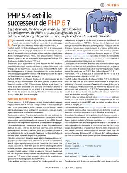 Cet événement aurait pu signer l'arrêt de mort du langage, mais il a au contraire insufflé un nouvel élan à son développement qui a abouti le mois dernier à la sortie de PHP 5.4. En effet, suite à l'arrêt du développement de PHP 6, la communauté des développeurs du langage s'est remise en question, ce qui a abouti à des modifications profondes et des évolutions significatives dans son fonctionnement. Ainsi, des fonctionnalités réclamées depuis longtemps par les utilisateurs du langage ont enfin pu être développées et intégrées dans PHP 5.4. À contrario, pour la première fois dans l'histoire de PHP, des fonctionnalités reconnues comme étant des « boulets historiques » du langage ont été supprimées. De plus, cette version contient, outre des développements originaux, des optimisations et des améliorations développées pour PHP 5 mais dont l'intégration avait été reportée dans l'attente de la sortie de PHP 6. Au final, PHP 5.4 est l'oeuvre de plus de 70 contributeurs qui ont effectué, en approximativement 700 jours, plus de 3400 modifications sur le code de PHP 5.3 ayant servi de base à son développement. Il est donc impossible d'en faire une présentation détaillée et exhaustive dans le cadre de cet article et je me contenterai donc d'en décrire les aspects les plus significatifs, à commencer par les fonctionnalités dont il ne dispose plus.