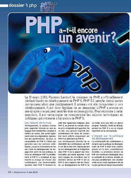 Le 11 mars 2010, Rasmus Lerdorf, le créateur de PHP, a officiellement déclaré l'arrêt du développement de PHP 6. PHP 5.3 semble n'avoir aucun successeur, alors que pratiquement 5 années ont été consacrées à son développement. Il est donc légitime de se demander si PHP a encore un avenir après ce qui peut sembler être un beau gâchis. Pour répondre à cette question, il est nécessaire de comprendre les raisons techniques et politiques qui ont mené à l'abandon de PHP 6.