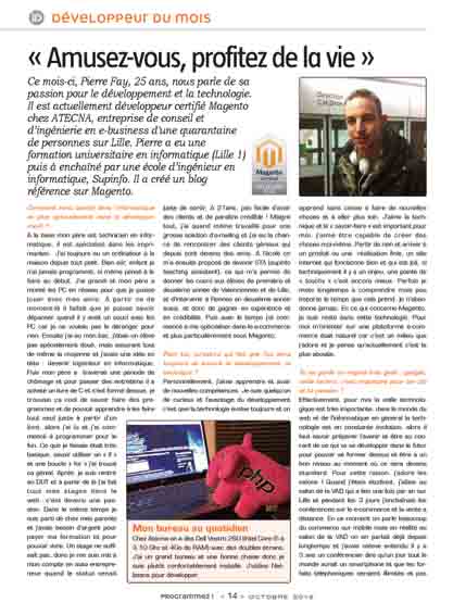 Ce mois-ci, Pierre Fay, 25 ans, nous parle de sa passion pour le développement et la technologie. Il est actuellement développeur certifié Magento chez ATECNA, entreprise de conseil et d’ingénierie en e-business d'une quarantaine de personnes sur Lille. Pierre a eu une formation universitaire en informatique (Lille 1) puis à enchaîné par une école d’ingénieur en informatique, Supinfo. Il a créé un blog référence sur Magento.