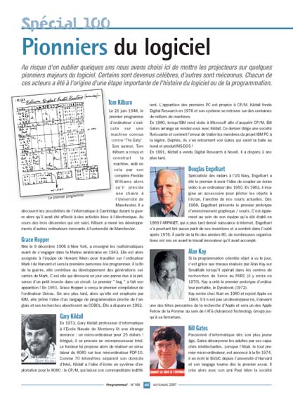 Au risque d'en oublier quelques uns nous avons choisi ici de mettre les projecteurs sur quelques pionniers majeurs du logiciel. Certains sont devenus célèbres, d’autres sont méconnus. Chacun de ces acteurs a été à l'origine d'une étape importante de l'histoire du logiciel ou de la programmation.