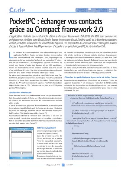 Les librairies de classes employées sont celles utilisées pour une application WinForm. Seules certaines librairies comme celles liées à PocketOutlook sont spécifiques. Ainsi, le passage d’un développement d’une application Winform à une application CF nécessite peu de modifications. Ces changements peuvent être limités en créant une librairie d’accès aux données et aux API spécifiques. Seules les modifications sur ces librairies seront à faire pour passer d’une plate-forme à l’autre. Une interface graphique développée pour l’une des deux plates-formes devra être refaite pour l’autre. Ce qui va nous intéresser dans cet article, c’est l’interfaçage avec PocketOutlook. Les premières versions du SDK pour PocketPC (Embedded Visual C++ et Visual Basic) permettaient d’accéder à PocketOutlook en utilisant des API COM communément appelées POOM (Pocket Outlook Object Model). Dans le CF2, l’utilisation de ces interfaces COM passe par des API managées.