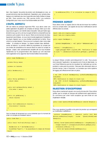 Dans le monde du développement logiciel, le paradigme orienté objet a fait une arrivée fracassante en apportant des concepts qui ont amélioré la productivité des développeurs et la maintenabilité des applications. Aujourd’hui cette approche se retrouve dans tous les secteurs du développement : applications d’entreprise, jeux vidéos, embarqué… La programmation orientée aspect (POA ou AOP en anglais), tente de répondre à une problématique que ne permet pas de couvrir la programmation par objet : la modularisation des fonctionnalités transversales des applications. On parle beaucoup de séparation des préoccupations. La POA permet d’apporter une réponse pragmatique en s’appuyant sur les langages de programmation existants. Il ne faut pas le voir comme une nouvelle approche mais bien comme une extension de la programmation orientée objet. La séparation des préoccupations permet d’éviter un effritement de la conception " pur objet ". Cette déviance intervient dans la phase de réalisation lorsque le développeur se retrouve au pied du mur pour implémenter une fonctionnalité transversale. Il va souvent choisir le plus simple, et pas forcément le plus correct. La POA encapsule ces fonctionnalités pour faciliter le travail du développeur. Pour être un peu plus concret voici les fonctionnalités que la POA permet de simplifier et même d’améliorer : messagerie applicative (log…), gestion de la sécurité (authentification…), persistance (transaction...), cache, etc. le code métier également : logique et domaine. Le nombre de lignes de code est en général réduit lorsqu’un projet a recours à ce paradigme.