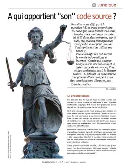 Vous êtes-vous déjà posé la question ? Etes-vous propriétaire du code que vous écrivez ? Si vous récupérez des morceaux de code ici et là dans des exemples, sur le web, etc, quelles conséquences cela peut-il avoir pour vous ou l’entreprise qui va utiliser ces codes ? Plusieurs affaires ont secoué le monde informatique et Internet : Oracle qui attaque Google sur la licence Java et le code source de ce dernier, Free et des problèmes liés à la licence GNU/GPL. Utiliser un code source d’origine indéterminée peut avoir des conséquences désastreuses. Dura lex sed lex