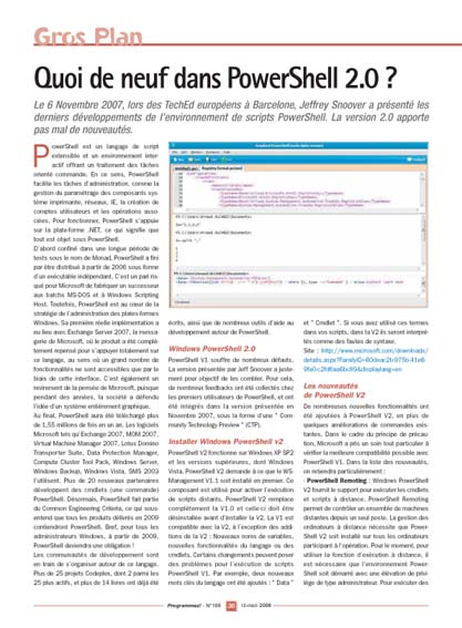 Le 6 Novembre 2007, lors des TechEd européens à Barcelone, Jeffrey Snoover a présenté les derniers développements de l’environnement de scripts PowerShell. La version 2.0 apporte pas mal de nouveautés.