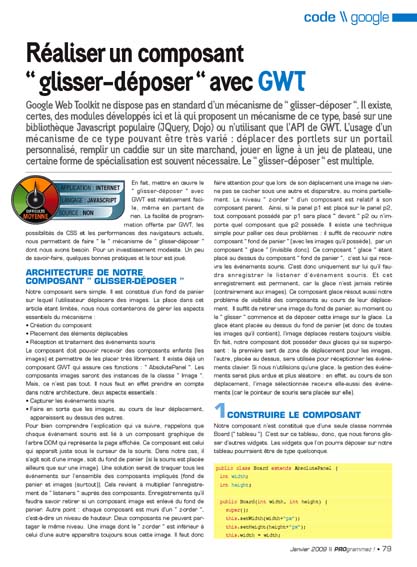 Google Web Toolkit ne dispose pas en standard d’un mécanisme de " glisser-déposer ". Il existe, certes, des modules développés ici et là qui proposent un mécanisme de ce type, basé sur une bibliothèque Javascript populaire (JQuery, Dojo) ou n’utilisant que l’API de GWT. L’usage d’un mécanisme de ce type pouvant être très varié : déplacer des portlets sur un portail personnalisé, remplir un caddie sur un site marchand, jouer en ligne à un jeu de plateau, une certaine forme de spécialisation est souvent nécessaire. Le " glisser-déposer " est multiple.