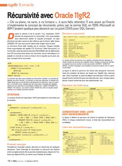 « Chi va piano, va sano, e va lontano », il aura fallu attendre 11 ans avant qu’Oracle n’implémente le concept de récursivité, prévu par la norme SQL en 1999. Microsoft et IBM l’avaient quelque peu devancé sur ce point (2005 pour SQL Server).
