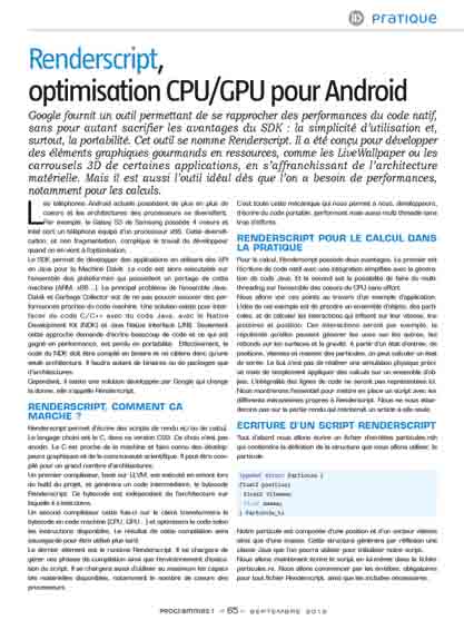 Google fournit un outil permettant de se rapprocher des performances du code natif, sans pour autant sacrifier les avantages du SDK : la simplicité d’utilisation et, surtout, la portabilité. Cet outil se nomme Renderscript. Il a été conçu pour développer des éléments graphiques gourmands en ressources, comme les LiveWallpaper ou les carrousels 3D de certaines applications, en s’affranchissant de l’architecture matérielle. Mais il est aussi l’outil idéal dès que l’on a besoin de performances, notamment pour les calculs.