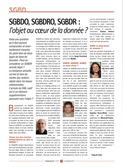 Basiquement, un SGBDO permet de manipuler des collections objets directement dans la base et les tables. On évite ainsi d’utiliser des outils de mapping relationnel objet qui s’occupent de faire le lien entre la donnée relationnelle et l’objet. Dans un SGBDRO, on rajoute des notions objets à la base relationnelle, avec stockage ou non des objets dans des tables.
