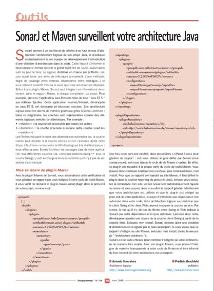 SonarJ permet à un architecte de décrire à un haut niveau d'abstraction l'architecture logique de son projet Java, et d’indiquer instantanément à son équipe de développement l'introduction d'une violation d'architecture dans le code. Cette faculté d'informer le développeur en temps réel est le grand point fort de l’outil : aucun autre outil ne peut le faire. Le logiciel, distribué en France par pcMetric, calcule aussi toute une série de métriques (complexité d'une méthode, degré de couplage entre classes, dépendance entre packages...) et vous prévient aussitôt lorsque le seuil que vous autorisez est dépassé. Grâce à son plug-in Maven, SonarJ peut intégrer ces informations directement dans le rapport Maven, à chaque compilation du projet. Pour exemple, prenons l’application Java Petstore tirée du livre " Java EE 5 " aux éditions Eyrolles. Cette application Internet/Intranet, développée en Java EE 5, est découpée en plusieurs couches. Son architecture logique peut être décrite de manière graphique grâce à SonarJ Architect