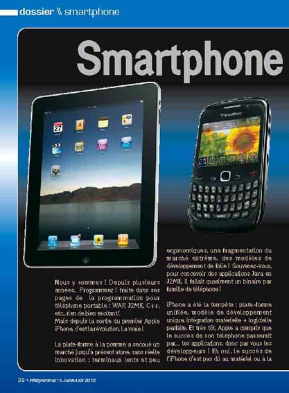 Aujourd’hui, dans les téléphones dits intelligents (Smartphones), iPhone et Android dominent, même si le Blackberry reste devant. Microsoft va tenter d’enrayer sa chute avec le prochain Windows Phone 7 qui est une réussite, surtout si on le compare à la version 6.5… Microsoft joue son avenir mobile avec Phone 7. Et c’est pour cela, que l’éditeur encourage dès maintenant les développeurs à tester, à développer les applications et éprouver la Market Place pour les applications mobiles. N’oublions pas non plus Android. En pleine croissance, les téléphones Android se vendent très bien malgré un démarrage un peu poussif. Nokia fait également de gros efforts pour promouvoir sa plateforme OVI. Dans notre dossier d’été, nous avons voulu vous faire découvrir quelques fonctions peu connues comme les technologies vocales d’Android ou encore comment bien démarrer un projet Windows Phone 7. Mais surtout, nous vous proposons dèsmaintenant de coder pour une nouvelle génération de terminaux : l’ iPad d’Apple. Aimé ou détesté, l’ iPad va décupler la créativité du développeur ! Maintenant c’est à vous de jouer, de développer. Serez-vous iPhone, Android, Windows Phone 7, ou autre chose ? Yes, you can !