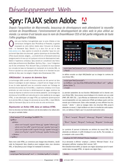 Outre une interface homogénéisée avec la suite d’Adobe et des connecteurs intelligents avec PhotoShop et Fireworks, la grande nouveauté de cette édition réside dans l’intrusion de librairies AJAX : le framework Spry. Dévoilé il y a plus d’un an sur le labs (labs.adobe.com), Spry exprime la volonté de simplifier l’ajout de comportement Ajax dans vos sites web : gestion dynamique de données XML, effets visuels évolués, widgets... La simplicité de ce framework plaira aux designers web et à ceux qui ont quelques notions de développement web. Dédié à l’expérience utilisateur, Spry viendra en complément des frameworks Ajax professionnels (BackBase, Symfony, Dojo…) pour l’intégration aux SI des entreprises. Pour découvrir Spry, je propose de vous exposer les concepts de base du framework en manipulant de la donnée XML. Je finirai en ajoutant au code quelques effets visuels et en étendant les possibilités de Spry avec les widgets intégrés dans Dreamweaver CS3.