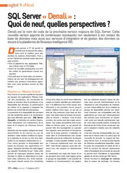 Denali est le nom de code de la prochaine version majeure de SQL Server. Cette nouvelle version apporte de nombreuses nouveautés non seulement à son moteur de base de données mais aussi aux services d'intégration et de gestion des données ou encore à la plateforme de Business Intelligence (BI).