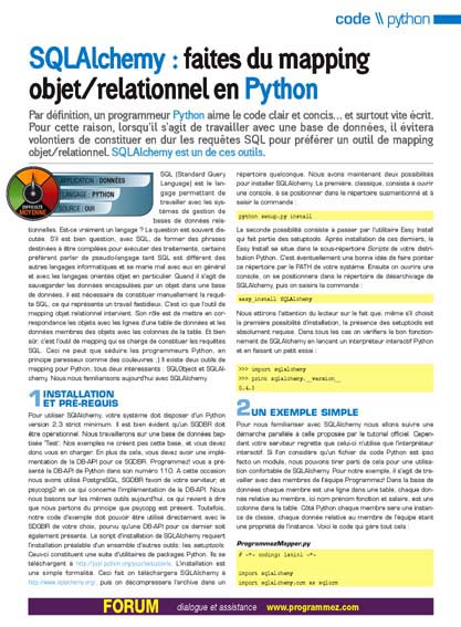SQL (Standard Query Language) est le langage permettant de travailler avec les systèmes de gestion de bases de données relationnelles. Est-ce vraiment un langage ? La question est souvent discutée. S'il est bien question, avec SQL, de former des phrases destinées à être compilées pour exécuter des traitements, certains préfèrent parler de pseudo-langage tant SQL est différent des autres langages informatiques et se marie mal avec eux en général et avec les langages orientés objet en particulier. Quand il s'agit de sauvegarder les données encapsulées par un objet dans une base de données, il est nécessaire de constituer manuellement la requête SQL, ce qui représente un travail fastidieux. C'est ici que l'outil de mapping objet relationnel intervient. Son rôle est de mettre en correspondance les objets avec les lignes d'une table de données et les données membres des objets avec les colonnes de la table. Et bien sûr, c'est l'outil de mapping qui se charge de constituer les requêtes SQL. Ceci ne peut que séduire les programmeurs Python, en principe paresseux comme des couleuvres ;) Il existe deux outils de mapping pour Python, tous deux intéressants : SQLObject et SQLAlchemy. Nous nous familiarisons aujourd'hui avec SQLAlchemy.