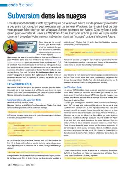 Une des fonctionnalités forts sympathiques de Windows Azure est de pouvoir y exécuter à peu près tout ce qu’on peut exécuter sur un serveur Windows. En résumé tout ce que vous pouvez faire tourner sur Windows Server, tournera sur Azure. C’est grâce à cela qu’on peut exécuter du Java sur Windows Azure. Dans cet article je vais vous présenter comment propulser votre serveur subversion dans les “nuages“ grâce à Windows Azure.