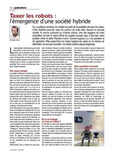 Il y a quelques semaines, les médias ont parlé de la possibilité de taxer les robots. Ce tte taxation pourrait , selon les auteurs de cette idée, financer la sécurité s oci a le, le revenu uni v e r sel o u d ’a u tres cho ses. Une des log iques d e c e tt e proposition est que le robot détruit les emplois humains donc il faut bien taxer quelque chose et aider l’humain à vivre. Comme toujours, il y a les partisans et les opposants. Mais aujourd’hui, les robots équipent les usines et ces chaînes de fabrication ne sont pas nouvelles ; les robots existent depuis longtemps.