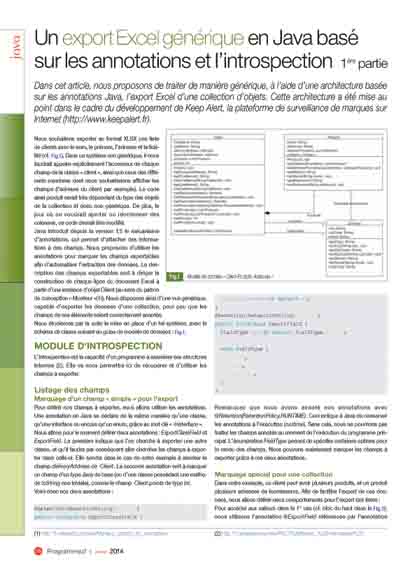 Dans cet article, nous proposons de traiter de manière générique, à l’aide d’une architecture basée sur les annotations Java, l’export Excel d’une collection d’objets. Cette architecture a été mise au point dans le cadre du développement de Keep Alert, la plateforme de surveillance de marques sur Internet (http://www.keepalert.fr)..