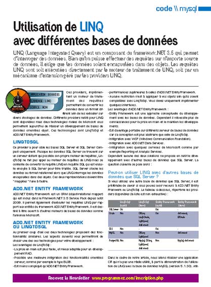 LINQ (Language Integrated Query) est un composant du framework.NET 3.5 qui permet d’interroger des données. Bien qu’on puisse effectuer des requêtes sur n’importe source de données, il exige que les données soient encapsulées dans des objets. Les requêtes LINQ sont soit exécutées directement par le moteur de traitement de LINQ, soit par un mécanisme d’extension géré par les providers LINQ.