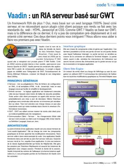 Un framework RIA de plus ? Oui, mais basé sur un seul langage (100% Java) côté serveur, et ne nécessitant aucun plugin côté client puisque son rendu se fait avec les standards du web : HTML, Javascript et CSS. Comme GWT ? Vaadin se base sur GWT; mais à la différence de ce dernier, il n'y a pas de compilation pré-déploiement et il est orienté côté serveur. Ces deux derniers points vous intriguent ? Nous allons vous aider à faire vos premiers pas avec Vaadin.