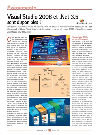 Cette annonce, bien que très attendue de la communauté des développeurs, n’était en soi pas une surprise majeure, mais plus une suite logique des évènements. L’annonce a été faite par S. Somasegar (Corporate Vice President of the Developer Division). Les versions françaises arriveront début 2008, sans doute pour les prochains TechDays, en février 2008. Cette annonce n’est pas dénuée de sens car Microsoft au travers de ce premier lancement, mettra du label 2008 sur une gamme de produits bien plus large, à savoir : Windows Server 2008, SQL Server 2008 et aussi Visual Studio 2008 qui prend tout son sens dans ce nouvel écosystème. Mais cet ef fet d’annonce et l’énergie déployée par le marketing de Microsoft sont-ils réellement justifiés, cette course effrénée à l’innovation n’est-elle pas seulement une volonté d’alimenter le marché à grand coups de publicité et ainsi d’activer les ventes de licences, même si nous sommes " in fine " dans ce type de spirale… ou bien le label " 2008 " de ces gammes de produits apporte-t-il réellement une valeur ajoutée non négligeable au développeur et de ce fait à l’entreprise qui l’emploie ?