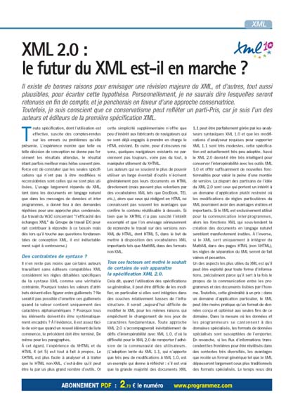 Dans le numéro précédent de votre magazine préféré (n°108), nous avions entamé le dossier XML. Nous avions évoqué les fondamentaux, les bonnes pratiques, avec quelques mises en oeuvre d’outils. Vous l’aurez compris, XML est aujourd’hui un élément inséparable des développeurs et même, sans qu’ils le sachent, des utilisateurs. De plus en plus de logiciels supportent, consomment et communiquent en XML. Ce qui ne va pas toujours sans problème, notamment sur le XHTML comme on le verra dans les pages qui suivent. Dans cette 2e partie, nous avons privilégié l’aspect pratique avec la validation par schéma (après avoir abordé celle par DTD) et le XSLT. Le XSLT est parfois négligé mais à y regarder de plus près, il ouvre une souplesse d’utilisation et de manipulation sans pareille ! Nous parlerons aussi d’évolution du XML avec une approche très réaliste et terrain de XML 2. Pour cela, un des " spécificateurs " de XML 1.0, Michael Sperberg-McQueen, nous dévoilera son approche. Mais comme XML le vaut bien, nous terminerons notre plongée au coeur d’XML le mois prochain, dans une 3e partie encore plus orientée code et mise en oeuvre. Bonne validation.